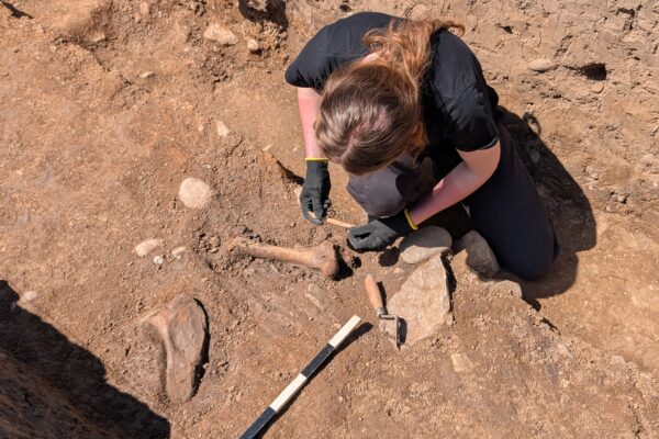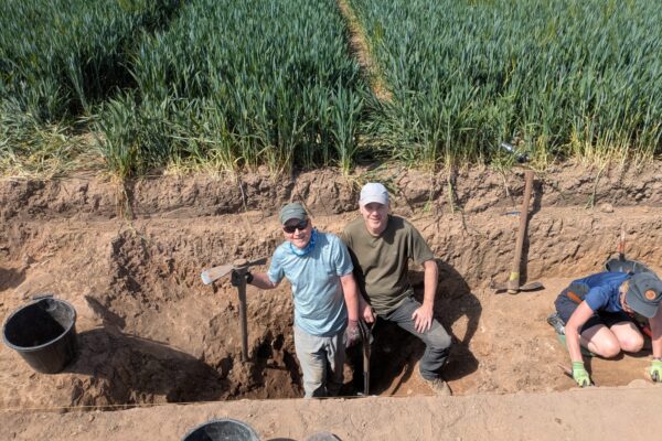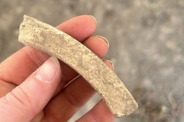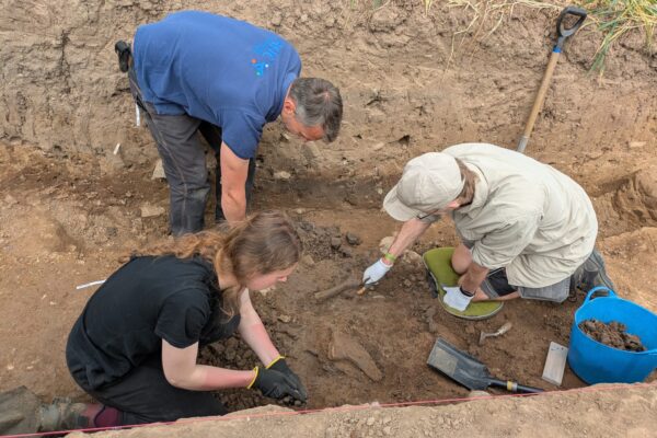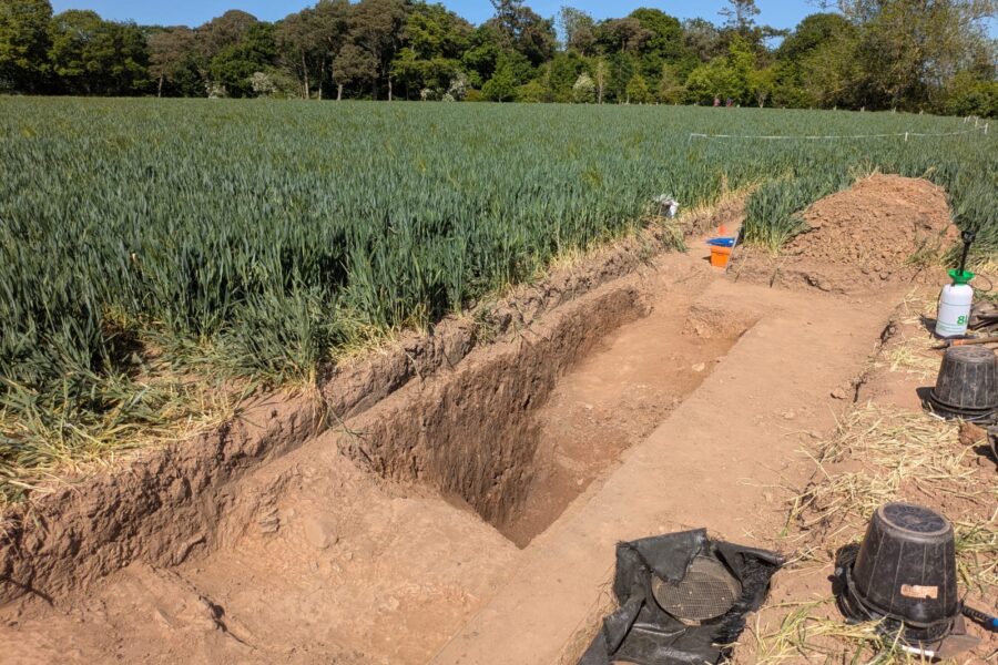Two trenches – Trench 1 and Trench 4 – were positioned to target a large sub-rectangular anomaly identified in geophysical survey data as a probable ditch forming the boundary of an enclosure. On excavation, this theory proved to be correct: a substantial ditch, over a metre deep with a bank on its interior edge, likely formed by upcast material from the digging of the ditch. The fill yielded a range of finds including animal bone of a range of species, and medieval pottery from a secure context at the base of the ditch, making it likely that the ditch itself is medieval. Evidence of a period of re-cutting and clearing the ditch perhaps indicates a period of change or reuse during its lifetime.