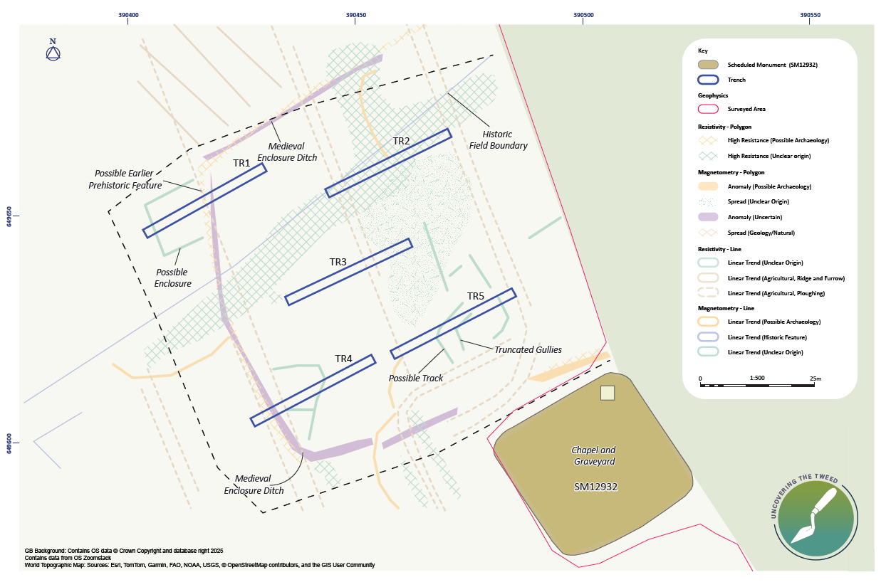 Around 700m east of the current village of Horndean lie the remains of a medieval church. While traces of the church are visible above the ground, it has long been believed that a village and hospital also lay nearby. Uncovering the Tweed has undertaken geophysical survey and excavations to shed a little light on one of the area’s past settlements.