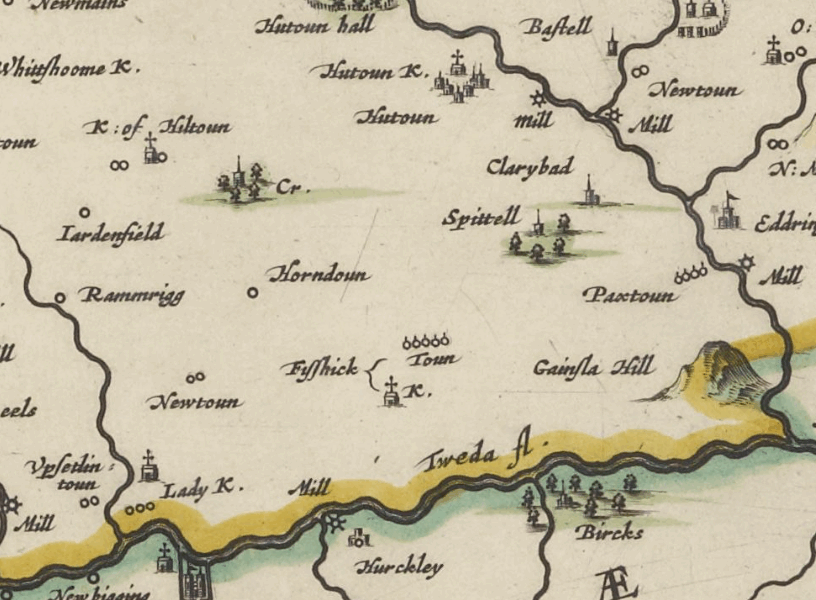 The earliest depiction of Horndean on a map appears to be in Blaeu’s Atlas of Scotland, 1654, which shows ‘Horndoun’ and, to the east of it, ‘Spittell’ (hospital).