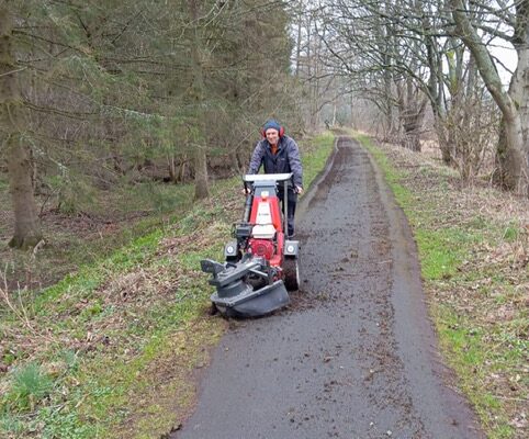 The acquisition of the Kersten K1500 tractor has allowed us to retrieve the edge of the path from encroaching growth of moss and other vegetation – previously done manually by volunteers using shovels. It is more effective and greater distances can be covered. It gives the volunteers more satisfaction, more rewarding. It also adds to the skill set in handling the machine. It gives the advantage of being able to work with other groups, Innerleithen and Walkerburn Community Trusts, promoting joint enterprise.